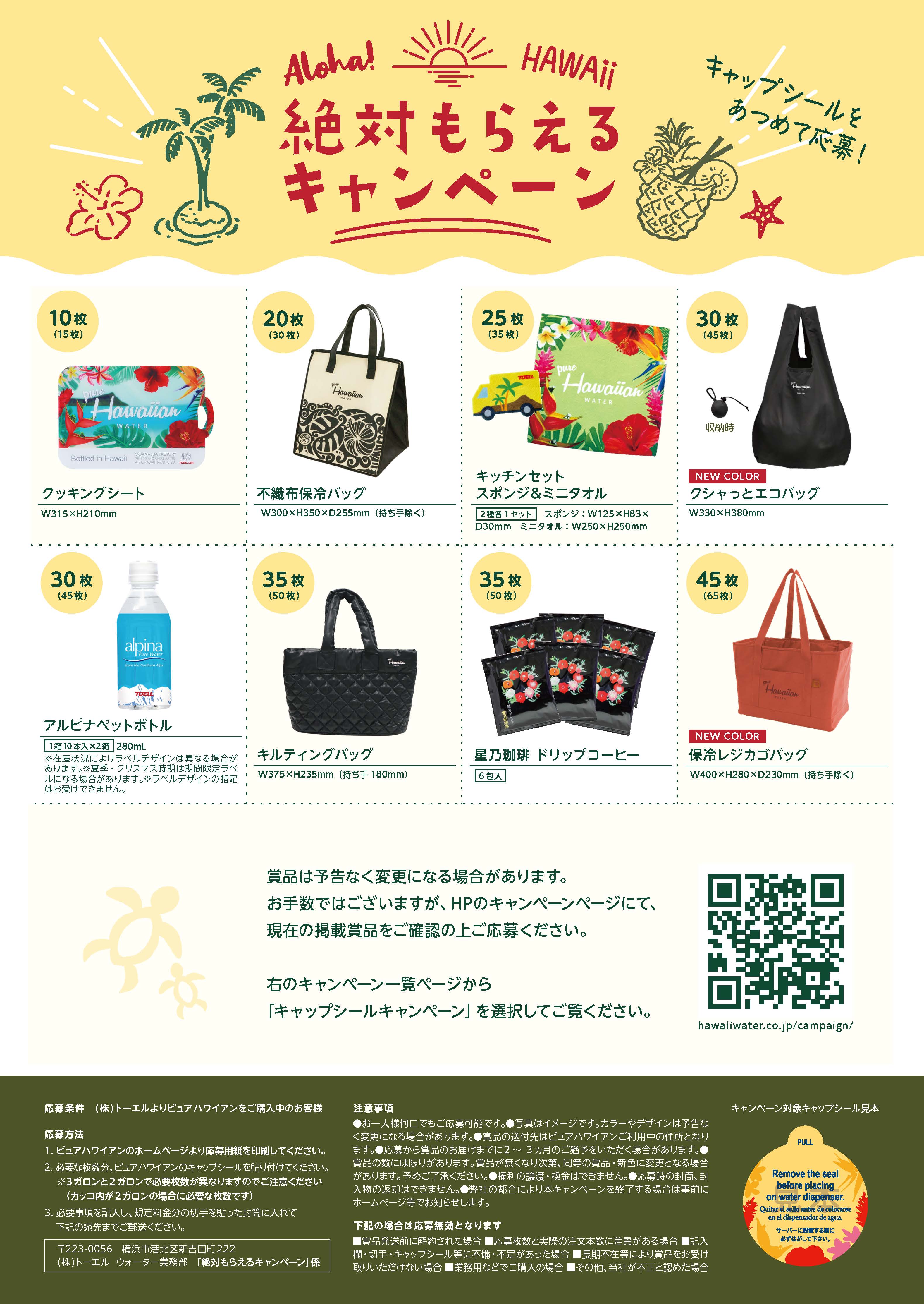 ピュアハワイアンボトルのキャップシールを集めて応募すると、枚数に応じてプレゼントがもらえるキャンペーン実施中!