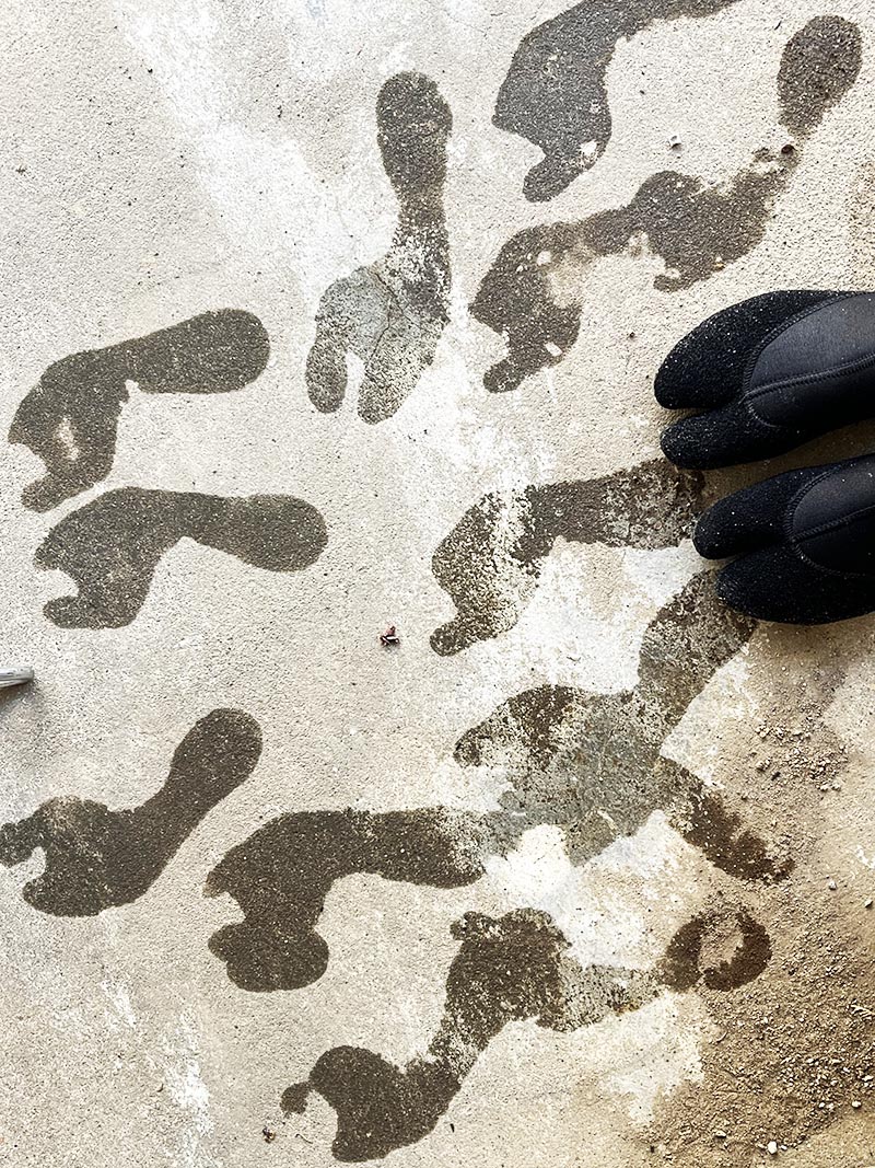 サーフィンを終えて自転車で帰ろうとしたところ、ふと足元を見れば、何とも愉快な事になっているではないですか。サーフブーツを履いたまま自転車の周りで帰り支度をしていた、その動きの足跡だ。裸足だと5本指の後があるけれど、それがないからか、色々なものに見えてくる。例えば、腰をくねらせ手を上げて踊る人。ドンドコドンドコと言うアフリカンドラムが聞こえてきそう。口を大きく開けて声高らかに歌う合唱団も、どうだろう? ハンマーなど工具を並べたかのようにも見えるし、また影絵のようでもあり、手で作った狐が写っているようにも見えるかな。皆様は、何を想像されますか?お暇な時に遊んでやって下さいませ♬