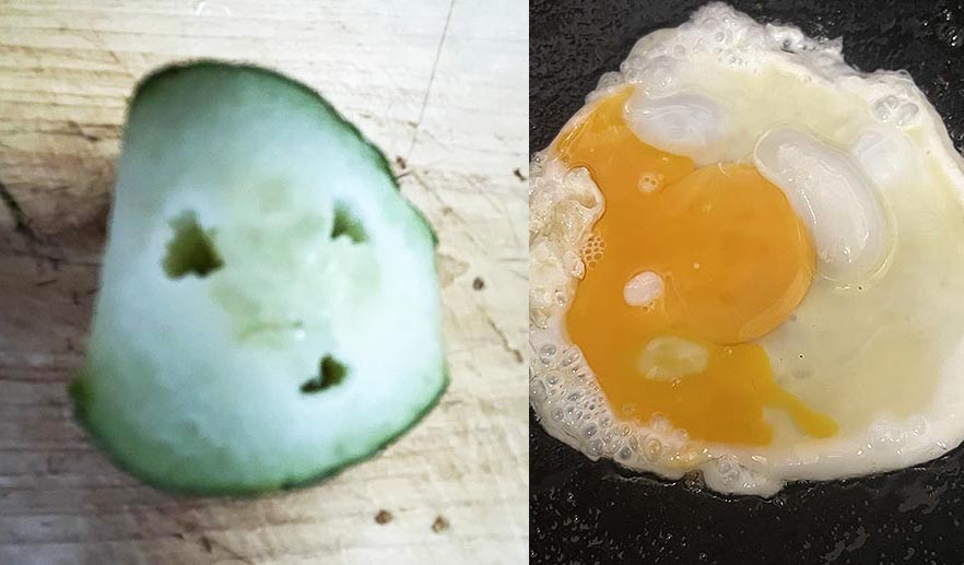 異常な暑さが続き野菜の生りが悪いようで、その為に旬のものでも価格が下がらない。困ったコマッタと嘆くのは人間ばかりでなく、むしろ当事者である野菜達も声なき声をあげている。ある朝胡瓜を切ったら、こんな悲しげな顔が現れた。「この蒸し暑さじゃ、いくら夏野菜ったってシャキッとなんてしてられまへんがな」、なんて愚痴が聞こえてきそうだ。本領発揮できず、さぞや悔しいだろう。異常気象を作った人間側として、申し訳ない気持ちになる。そして、卵。殻を割ると、ご覧のとおり。「鶏は夏バテしちゃうし、エサは獲れないし…アタシら黄身をピンッと立たせてなんかいられないわ!」と、やる気の無さと悲痛の声が伝わってくるようだ。野菜も果物も卵も豆も、みんな出来が悪ければ手にした人間から愚痴を聞かされる。でも育つ環境を悪くしているのはダレだ!と、彼らは声をあげているかもしれない。ほら、冷蔵庫から、お皿の上から、パックの中から、聞こえませんか…?