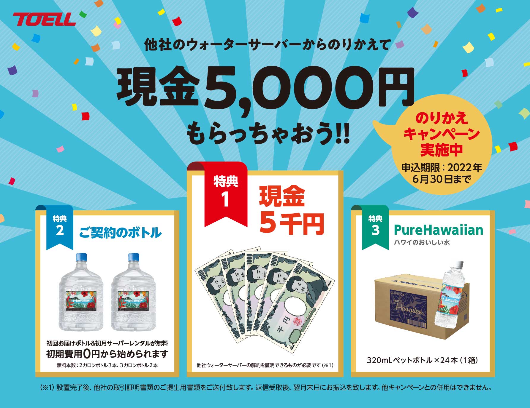 他社のウォーターサーバーをご利用中のお客様がピュアハワイアンにのりかえると、もれなく現金5,000円、初回お届け分のボトル、ピュアハワイアンペットボトル(320mL×24本)がもらえるキャンペーンです。
