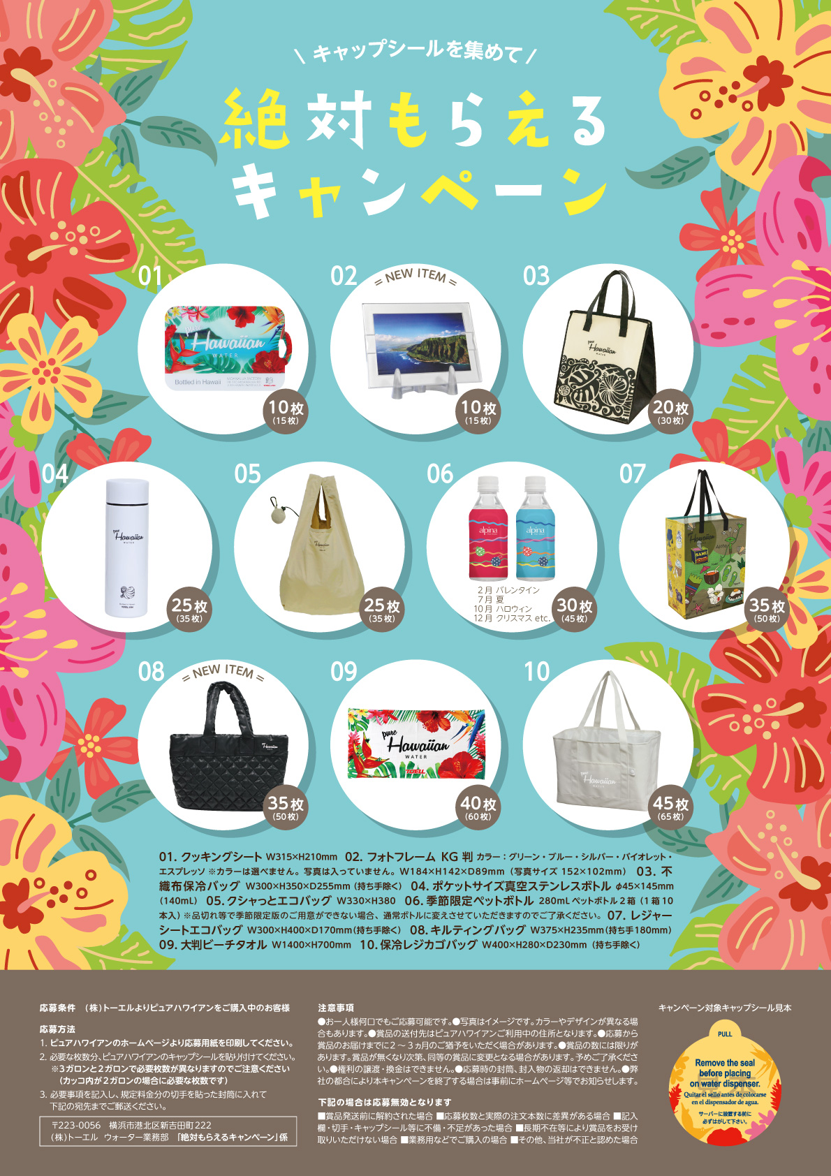 ピュアハワイアンボトルのキャップシールを集めて応募すると、枚数に応じてプレゼントがもらえるキャンペーン実施中!