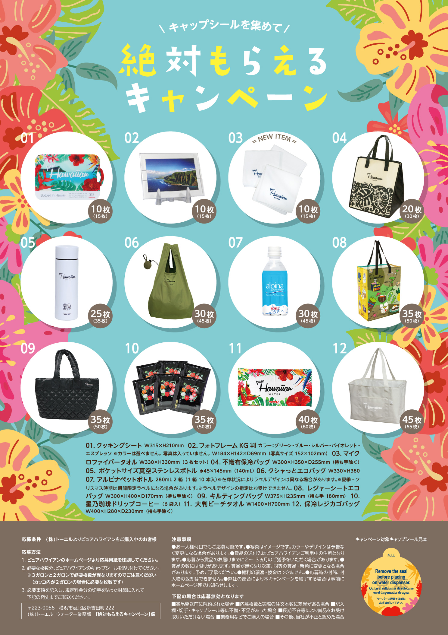 - 応募方法:ピュアハワイアンのキャップシールを応募に必要な枚数分貼り付けて、必要事項を記入の上、ご郵送ください