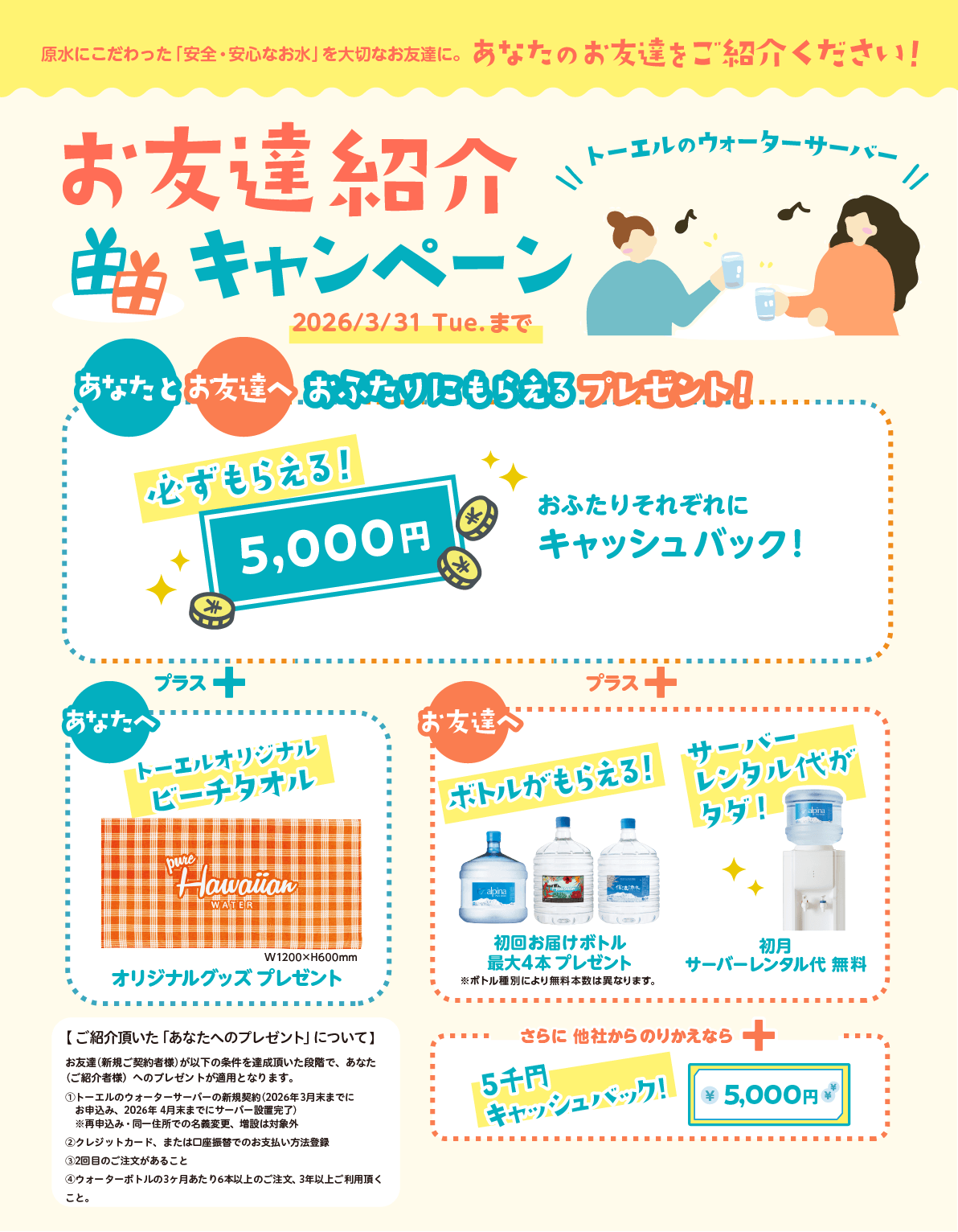 - 特典賞品発送時にご契約者様・ご紹介者様それぞれがウォーターサーバーのご契約中でない場合、権利は消滅します。再度ご契約いただいた場合でも、本キャンペーンは適用されません。
