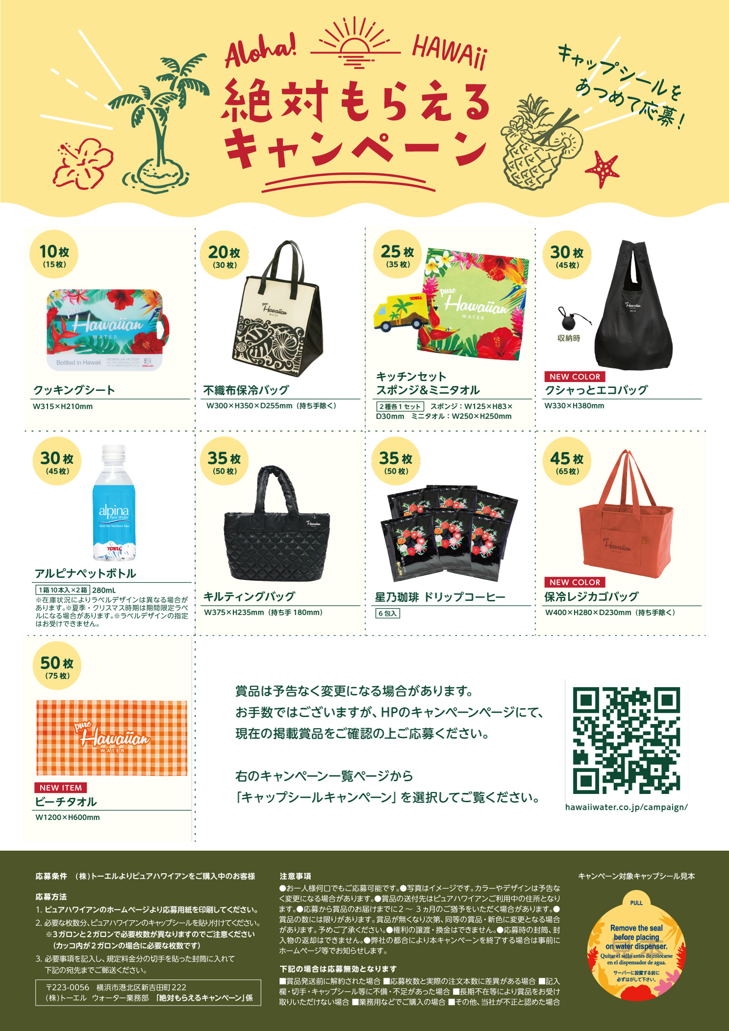 - 応募方法:ピュアハワイアンのキャップシールを応募に必要な枚数分貼り付けて、必要事項を記入の上、ご郵送ください